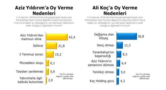 Araştırmanın ön bulgularına göre, Ali Koç'u destekleyen kongre üyelerinin %36,8'i kulübün yeni bir kan değişikliğine ihtiyacı olduğu ifade ederken, %11,3'ü Ali Koç'un genç olması nedeniyle destek verdiğini belirtmektedir. Ayrıca %8,5'lik bir oran Fenerbahçe'nin sportif alandaki başarısızlıkları ve yüzde 6,4'lük oran Aziz Yıldırım'a olan tepki nedeniyle Ali Koç'a oy vereceğini belirtmektedir. Aziz Yıldırım'a oy vereceğini belirtenler ise gerekçe olarak yönetimden duydukları memnuniyet (%42,4), istikrar (%21,8) ve 3 Temmuz sürecindeki mücadeleci duruşu göstermektedir.