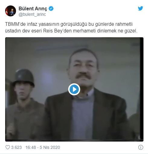 Arınç, Twitter hesabından infaz yasası ile ilgili yaptığı paylaşımında "Rahmetli üstadın dev eseri Reis Bey’den merhameti dinlemek ne güzel" diyerek Necip Fazıl’ın tiyatro oyunundaki bir tiradının olduğu eski bir Türk filmi sahnesini paylaştı.