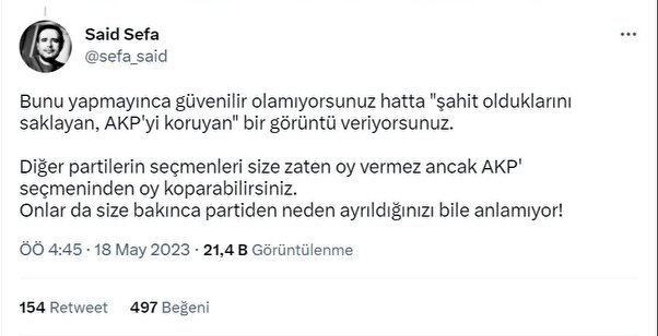 Said Sefa, “Bunu yapmayınca güvenilir olamıyorsunuz hatta şahit olduklarını saklayan, AK Parti'yi koruyan bir görüntü veriyorsunuz. Diğer partilerin seçmenleri size zaten oy vermez ancak AK Parti seçmeninden oy koparabilirsiniz. Onlar da size bakınca partiden neden ayrıldığınızı bile anlamıyor” ifadelerini kullandı.