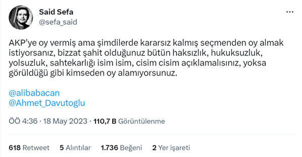 FETÖ’vü Sefa, “AKP'ye oy vermiş ama şimdilerde kararsız kalmış seçmenden oy almak istiyorsanız, bizzat şahit olduğunuz bütün haksızlık, hukuksuzluk, yolsuzluk, sahtekarlığı isim isim, cisim cisim açıklamalısınız, yoksa görüldüğü gibi kimseden oy alamıyorsunuz” tweetiyle Babacan ve Davutoğlu’na itirafçılık çağrısı yaptı.