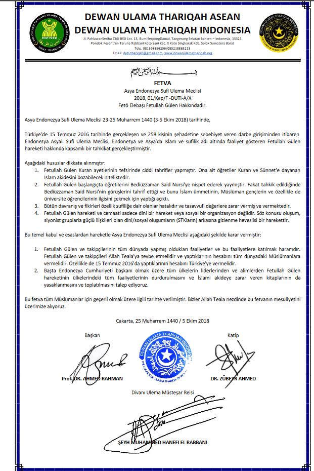Asya Endonezya Sufi Ulema Meclisi, Fetullahçı Terör Örgütü (FETÖ) ile ilgili bir fetva yayımladı. Fetvada FETÖ elebaşısı Gülen'in Kuran ayetlerini tahrif ettiği vurgulanırken, tüm ülkelerin FETÖ faaliyetlerini durdurması ve yayınlarının toplatılması çağrısında bulunuldu.