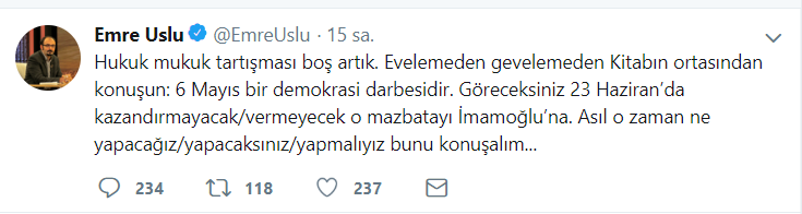 "Hukuk mukuk tartışması boş artık. Evelemeden gevelemeden Kitabın ortasından konuşun: 6 Mayıs bir demokrasi darbesidir. Göreceksiniz 23 Haziran’da kazandırmayacak/vermeyecek o mazbatayı İmamoğlu’na. Asıl o zaman ne yapacağız/yapacaksınız/yapmalıyız bunu konuşalım..."