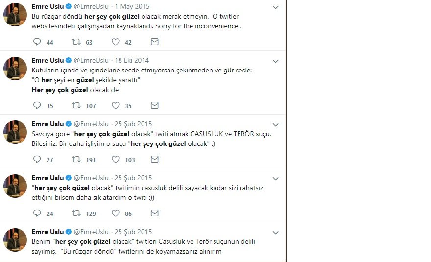 FETÖ'cü Emre Uslu'nun 15 Temmuz darbe girişimi öncesi 14 Nisan 2016 günü de "Müebbet ile yargılandıkları davanın delili 'Her şey çok güzel olacak' twitim. Yeni dava için delil olsun 'Baharın en güzel ayıdır Mayıs" tweetini attığı da belirlendi. CHP ve İYİ Parti ve HDP destekli 31 Mart yerel seçimlerde seçim sloganı olarak 'Martın sonu bahar' olarak belirlenmiş ve iki söz arasında oldukça benzerlik gösteriyor.