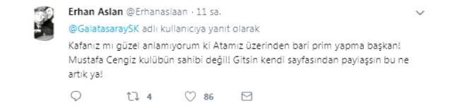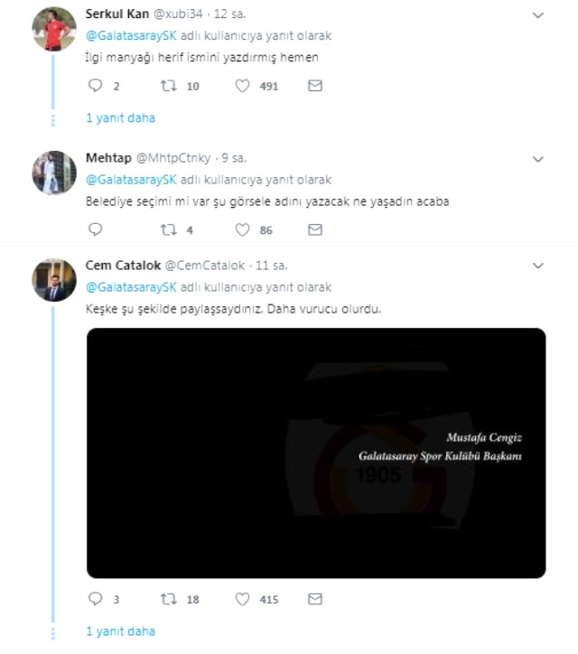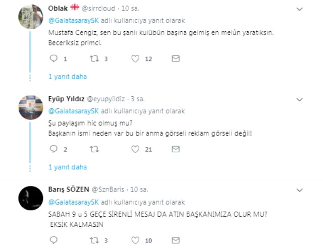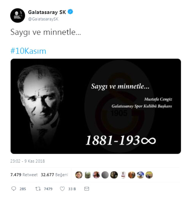 Sarı-kırmızılıların resmi Twitter adresi, 10 Kasım'la ilgili yaptığı paylaşımla tepkilerin odağında yer aldı. Atatürk'ün fotoğrafıyla yapılan paylaşımda, Galatasaray Başkanı Mustafa Cengiz'in de isminin bulunması, taraftarları kızdırdı.