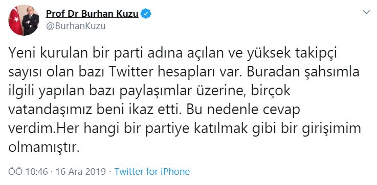 Burhan Kuzu daha sonra sosyal medya hesabı Twitter'dan konuya ilişkin yeni bir paylaşım yaptı ve 'Yeni kurulan bir parti adına açılan ve yüksek takipçi sayısı olan bazı Twitter hesapları var. Buradan şahsımla ilgili yapılan bazı paylaşımlar üzerine, birçok vatandaşımız beni ikaz etti. Bu nedenle cevap verdim.Her hangi bir partiye katılmak gibi bir girişimim olmamıştır.' dedi.