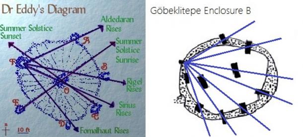 Bazı bilim adamları (BG Sidharth, Giuglio Magli ve A. De Lorenzis) ve araştırmacılar (Joe Plegge, Andrew Collins) Göbekli Tepe'nin göksel bir gözlemevi olarak kullanıldığını belirtmektedir. Göbekli Tepe Muhafaza B'nin, önemli yıldızların veya takımyıldızların doğumunu gözlemleyebileceği bir tür “ilaç çarkı” olduğu da iddia ediliyor.