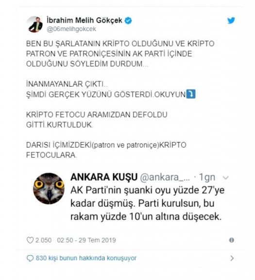 "Ankara Kuşu" adlı Twitter hesabının "yeni parti" süreciyle ilgili mesajına dikkat çeken Melih Gökçek de kendi hesabından "Ben bu şarlatanın kripto olduğunu ve kripto patron ve patroniçesinin AK Parti içinde olduğunu söyledim durdum.