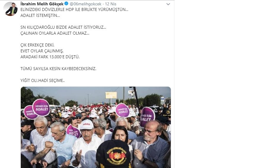 Gökçek twitter hesabından yaptığı açıklamada; “Elinizdeki dövizlerle HDP ile birlikte yürümüştün... Adalet istemiştin... Sn. Kılıçdaroğlu bizde adalet istiyoruz... Çalınan oylarla adalet olmaz... Çık erkekçe deki, evet oylar çalınmış, aradaki fark 13.000’e düştü. Tümü sayılsa kesin kaybedeceksiniz. Yiğit ol! Hadi seçime..” ifadelerini kullandı.