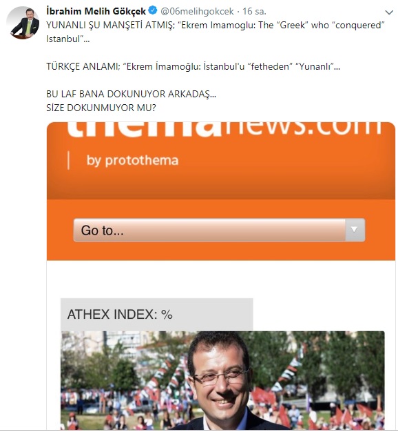 Gökçek, twitter hesabından Yunan medyasının yaptığı haberi paylaşarak şunları kaydetti; “Yunanlı şu manşeti atmış; “Ekrem İmamoglu: The “Greek” who “Conquered” İstanbul”... Türkçe anlamı; “Ekrem İmamoğlu: İstanbul'u “fetheden” “Yunanlı”... Bu laf bana dokunuyor arkadaş... Size dokunmuyor mu?”