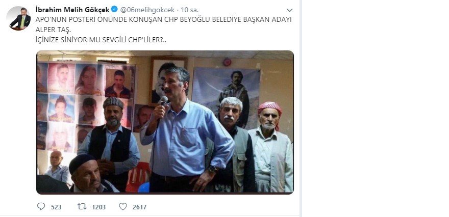 "Apo'nun posteri önünde konuşan CHP Beyoğlu Belediye Başkan Adayı Alper Taş. İçinize siniyor mu sevgili CHP'liler?.." ifadelerini kullandı.