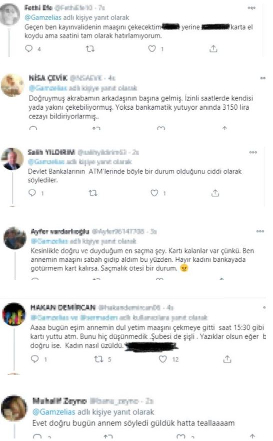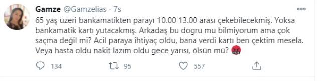 Bir kullanıcının Twitter hesabından, "65 yaş üzeri bankamatikten parayı 10.00 13.00 arası çekebilecekmiş. Yoksa bankamatik kartı yutacakmış. Arkadaş bu doğru mu bilmiyorum ama çok saçma değil mi? Acil paraya ihtiyaç oldu, bana verdi kartı, ben çektim mesela. Veya hasta oldu, nakit lazım oldu gece yarısı, ölsün mü?" iddiasını gündeme getirmesiyle sosyal medya bir anda karıştı.