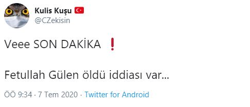 Twitter üzerinde bazı hesaplarda yapılan paylaşımlarda Fetullah Gülen'in öldüğüne dair bazı iddialar ortaya atıldı.