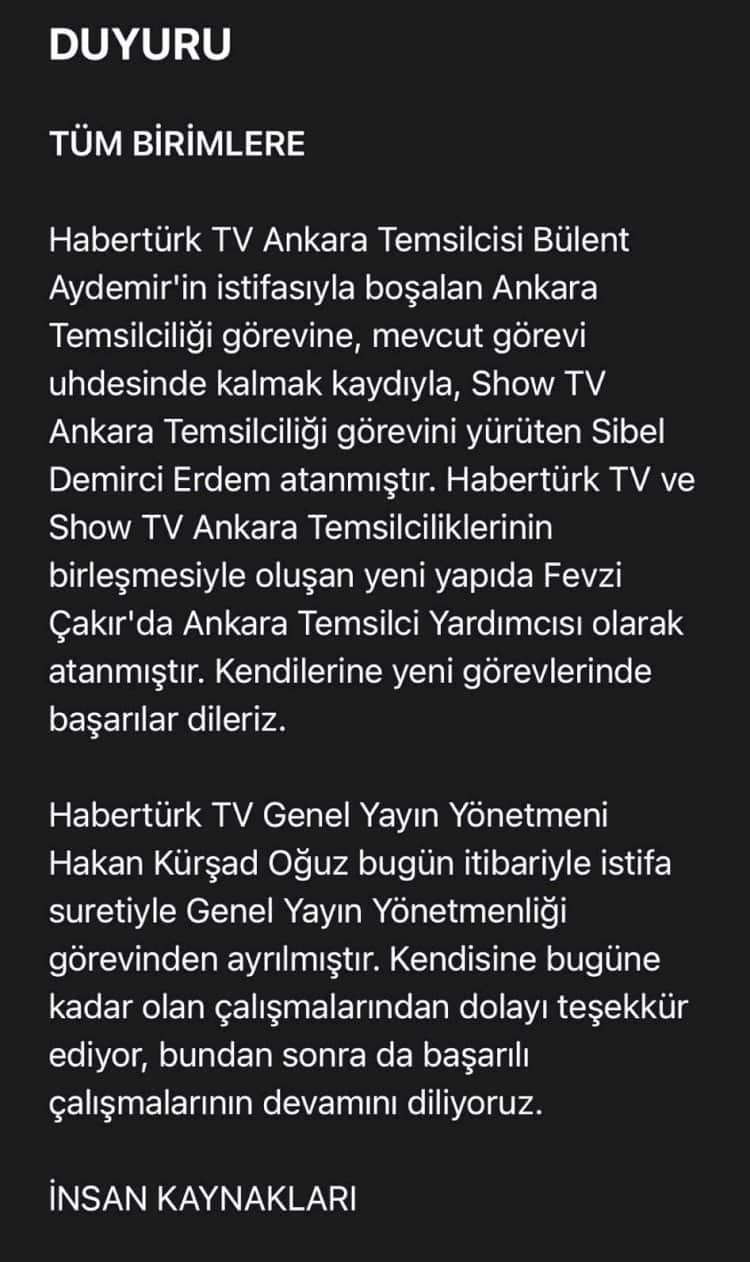 Yapılan açıklamada Habertürk Ankara Temsilcisi Bülent Aydemir'in istifa ettiği ve yerine Show TV Ankara Temsilcisi Sibel Demirci'nin atandığı ifade edildi.