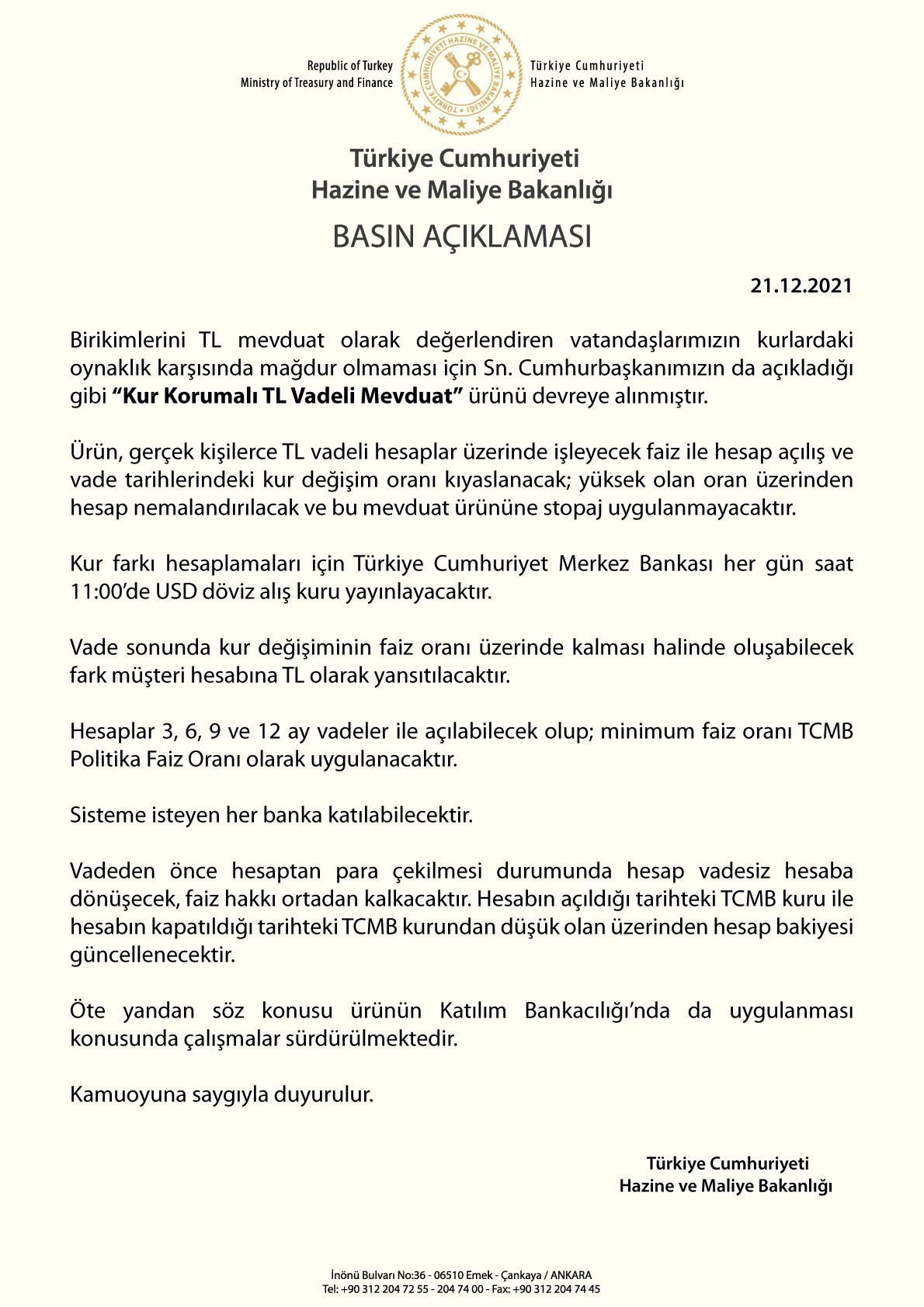 "Birikimlerini TL mevduat olarak değerlendiren vatandaşlarımızın kurlardaki oynaklık karşısında mağdur olmaması için Sn. Cumhurbaşkanımızın da açıkladığı gibi "Kur Korumalı TL Vadeli Mevduat" ürünü devreye alınmıştır.