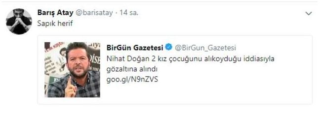 İki kız çocuğunu rehin aldığı gerekçesiyle gözaltına alınan Nihat Doğan’a tepkiler çığ gibi büyüdü. HDP’li Barış Atay da sosyal medya hesabından Nihat Doğan’a tepki gösterdi.