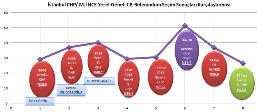 2004 Yerel seçimlerinde CHP adayı Sefa SİRMEN’nin %28,9’luk oy oranını, K. KILIÇDAROĞLU %37’ye, 2014 Yerel Seçimlerinde de Mustafa SARIGÜL ile %40,1’e çıkarırken; aradan geçen 4 yılın sonunda 24 Haziran Genel Seçimlerinde CHP’nin oy oranının %26,5’e gerilemesi birçok tartışmayı da beraberinde getirmektedir.