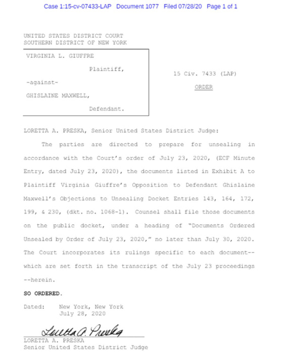 ABD’de Federal Mahkeme Bölge Hakimi Loretta Preska, pedofil milyarder ve çocuk taciri Epstein’in tutukluğu bulunduğu hücresindeki intiharından sonra mühürlenen gizli belgelerin Perşembe günü açılmasını ve kamuoyu ile paylaşılmasını iki sayfalık resmi bir yazı ile emretti.