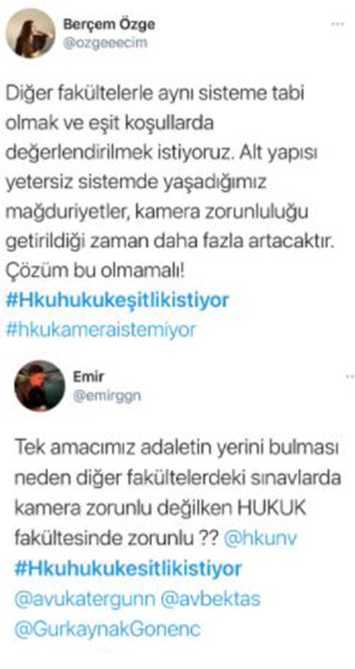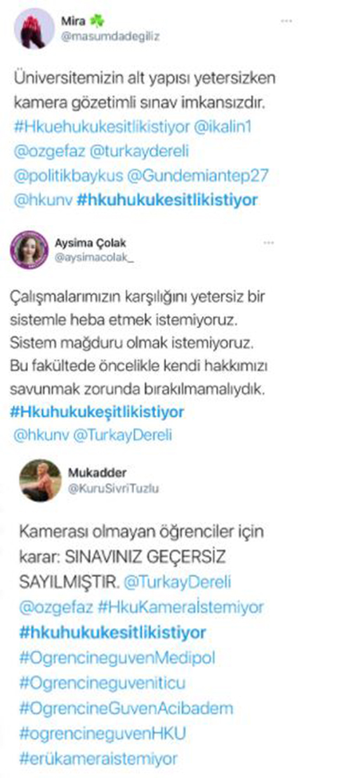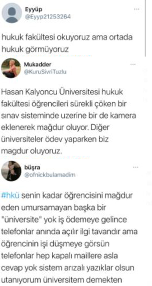 Öğrenciler ise attıkları tweetlerde 'Üniversitede diğer fakülteler ödev şeklinde bu sınavları yapıyor bize neden kameralı sınav yapıyorsunuz, üniversitenin sistemi iyi çalışmıyor, sınav anında kısa bir süre içinde cevapları bir çok arkadaşımız yüklemeyi başaramadı, internet ara sıra kesiliyor ve biz mağdur oluyoruz, biz de final sınavlarını ödev şeklinde yapalım.' diyerek mağduriyetlerini dile getiriyor.