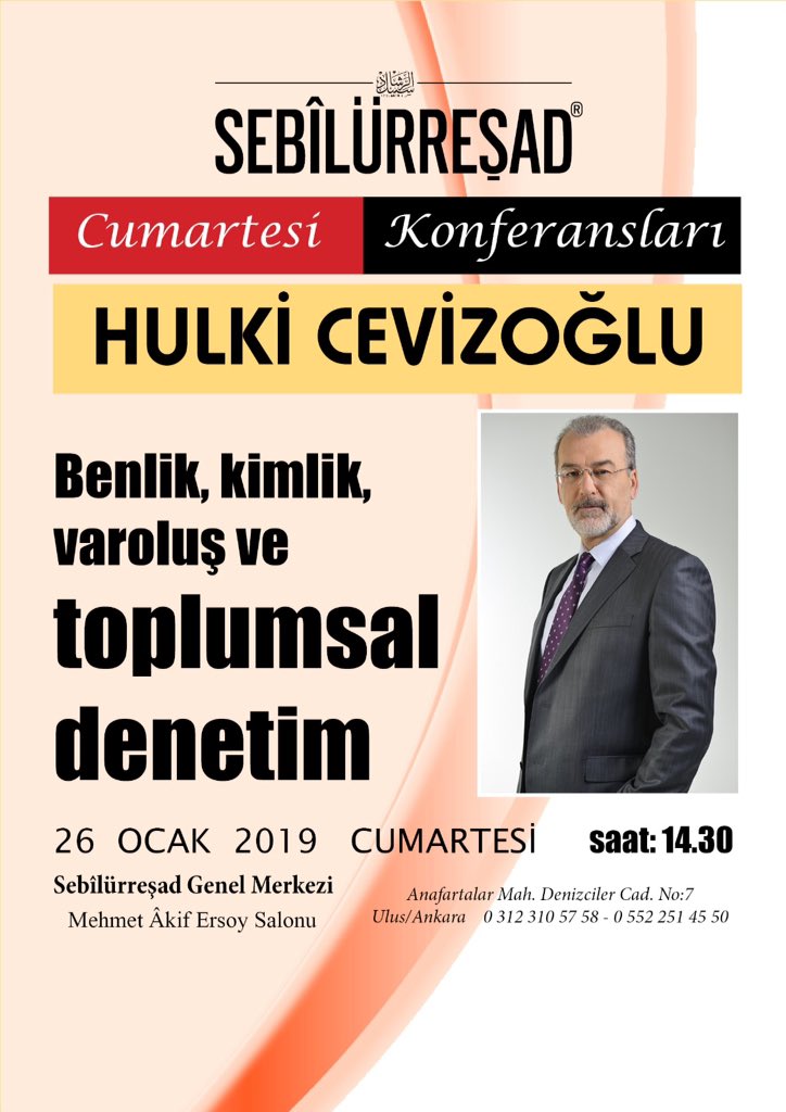 Mehmet Akif Ersoy’un yayınladığı, günümüzde de Ersoy ailesinin katkılarıyla çıkan Sebilürreşad dergisinin Cumartesi Konferansları'na bu hafta Hulki Cevizoğlu konuk oluyor.