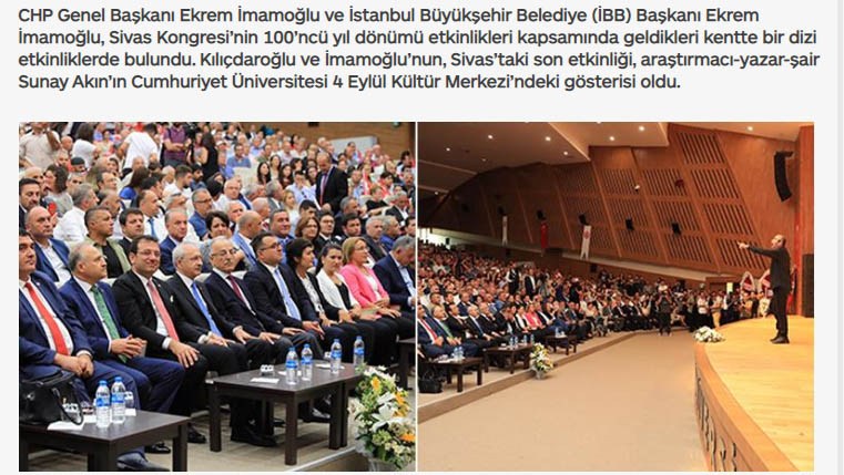 'CHP Genel Başkanı Ekrem İmamoğlu ve İstanbul Büyükşehir Belediye (İBB) Başkanı Ekrem İmamoğlu, Sivas Kongresi’nin 100’ncü yıl dönümü etkinlikleri kapsamında geldikleri kentte bir dizi etkinliklerde bulundu. Kılıçdaroğlu ve İmamoğlu’nun, Sivas’taki son etkinliği, araştırmacı-yazar-şair Sunay Akın’ın Cumhuriyet Üniversitesi 4 Eylül Kültür Merkezi’ndeki gösterisi oldu.'