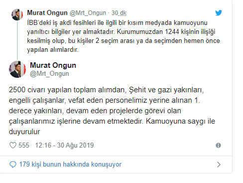 Ongun, Ekrem İmamoğlu'nun mazbatasını ilk aldığı tarihten seçimin yenilendiği tarihe kadar geçen sürede 2 bin 500 kişi civarında alımın olduğunu belirterek bu alımlardan şehit ve gazi yakınları, engelli çalışanlar, vefat eden personel yerine alınan birinci derece yakınlarının devam eden projelerde görevi olan çalışanların işlerine devam ettiğini duyurdu.