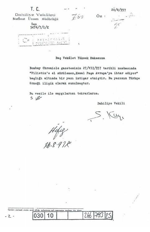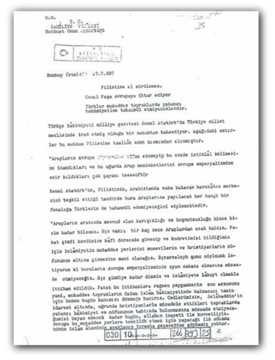 İçişleri Bakanlığı arşivlerinde yer alan belgede, 1937 temmuzunda Bombay Chronicle adlı gazetede Mustafa Kemal Atatürk’e atfen "Filistin'e el sürülemez, Kemal Paşa Avrupa'yı ihtar ediyor" başlıklı makale yer alıyor.