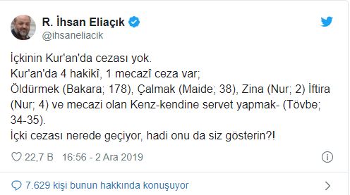 Tam da bu iddianın gündemde olduğu süreçte ilahiyatçı İhsan Eliaçık, Twitter hesabından yaptığı paylaşımda Kur'an’da içki içmenin cezası olmadığını öne sürdü ve bir de çağrıda bulundu: