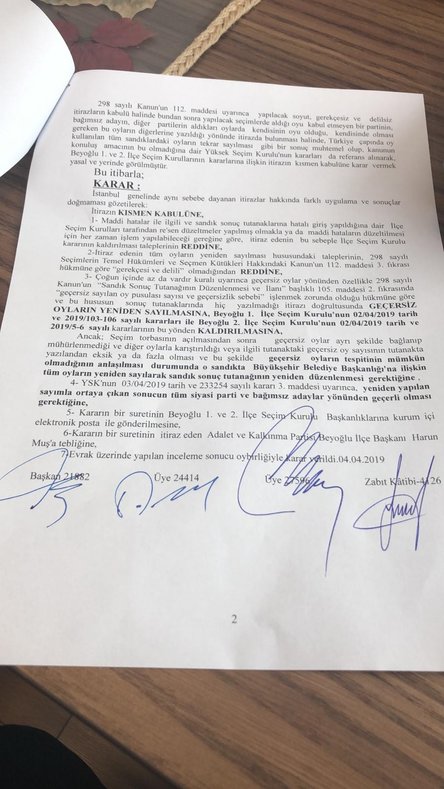 İstanbul İl Seçim Kurulu Başkanlığı, "Çoğun içinde az da vardır kuralı gereğince geçersiz oylar yönünden özellikle 298 sayılı Kanun'un 'Sandık Sonuç Tutanağının Düzenlenmesi ve İlanı' başlıklı 105’inci Maddesi 2’nci Fıkrasında 'geçersiz sayılan oy pusulası sayısı ve geçersizlik sebebi' işlenmek zorunda olduğu hükmüne göre ve bu hususun sonuç tutanaklarında hiç yazılmadığı itirazı doğrultusunda geçersiz oyların yeniden sayılmasına…" dedi. Alınan yeni kararda, tüm oyların sayılmasına ilişkin talep ise reddedildi.