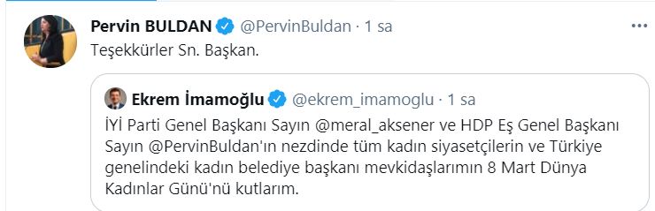 İBB Başkanı Ekrem İmamoğlu, 8 Mart Dünya Kadınlar Günü nedeniyle sosyal medya üzerinden HDP'li Pervin Buldan'a tebrik mesajı yayınladı.