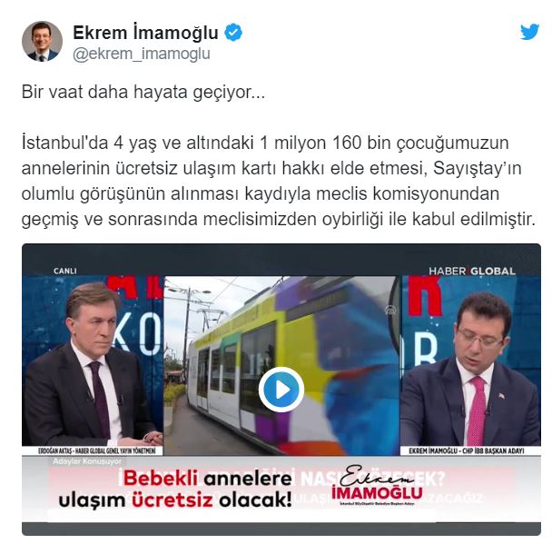 "Bir vaat daha hayata geçiyor... İstanbul'da 4 yaş ve altındaki 1 milyon 160 bin çocuğumuzun annelerinin ücretsiz ulaşım kartı hakkı elde etmesi, Sayıştay'ın olumlu görüşünün alınması kaydıyla meclis komisyonundan geçmiş ve sonrasında meclisimizden oybirliği ile kabul edilmiştir."