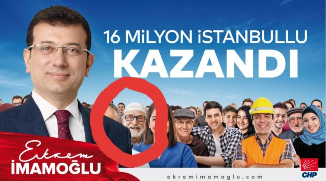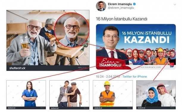 CHP’li Ekrem İmamoğlu itiraz süreci devam ederken İBB Başkanı adıyla kullandığı reklam afişinde takkeli dede biracı, başörtülü kadın görünümlü kişiler dahil fotoğrafta olanların hepsi yabancı olduğu ortaya çıktı.