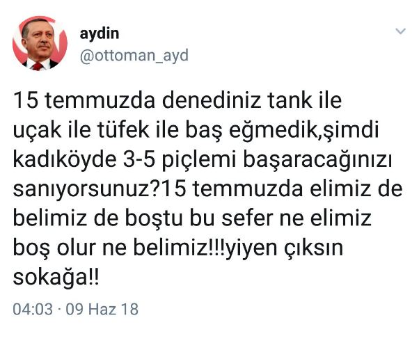 “15 Temmuz'da denediniz tank ile uçak ile tüfek ile baş eğmedik, şimdi Kadıköy'de 3-5 piçle mi başaracağınızı sanıyorsunuz? 15 Temmuz'da elimiz de belimiz de boştu bu sefer ne elimiz boş olur ne belimiz!!! Yiyen çıksın sokağa!!!”