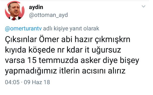“Çıksınlar Ömer abi hazır çıkmışken kıyıda köşede ne kadar it uğursuz varsa 15 Temmuz'da asker diye bir şey yapmadığımız itlerin acısını alırız.”