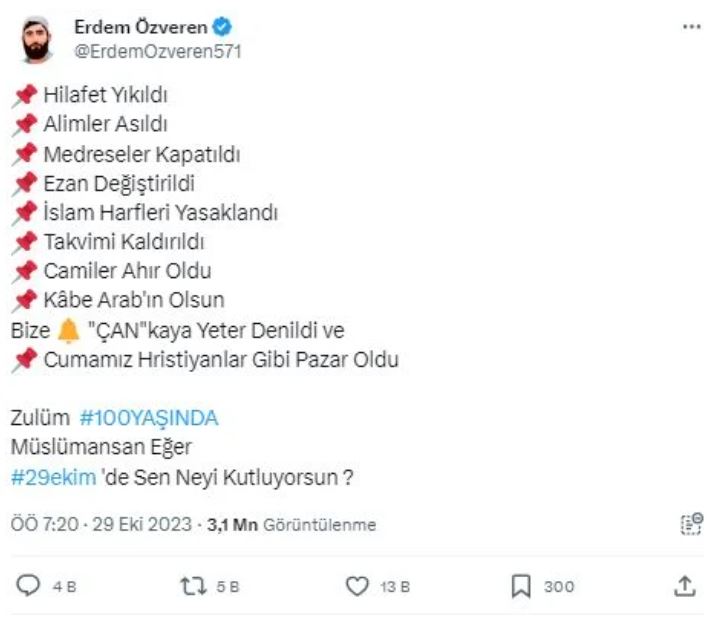 İsmailağa Cemaati'ne bağlı Müdafa-i İslam Hareketi Başkanı Erdem Özveren, Cumhuriyet'imiz için zulüm yakıştırması yaptı.