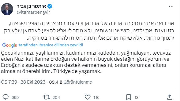 Gvir, 'Erdoğan'a sadece uzaktan destek vermeyi değil, Türkiye'de yaşayabilmeleri için onları koruması altına almayı da teklif edebilirim.' dedi.
