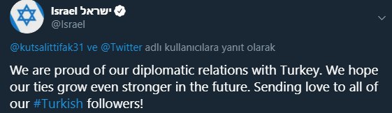 Geçtiğimiz günlerde İsrail’in twitter hesabı bir yazı yazdı. 'Türkiye ile olan diplomatik ilişkilerimizle gurur duyuyoruz. Gelecekte bağlarımızın daha da güçleneceğini umuyoruz. Tümümüze sevgi göndermek #Turkish takipçiler!’’