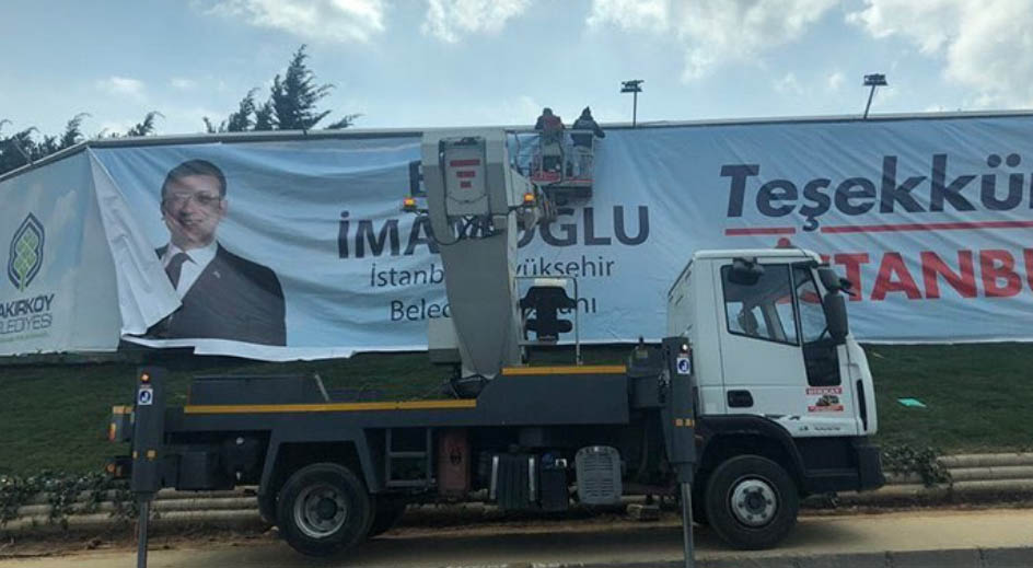 Yerel seçimin ardından resmî olmayan sonuçlara göre AK Parti’li rakibi Binali Yıldırım’a göre 20 bin fazla oy alan İmamoğlu, şehre teşekkür pankartları astırıyor.