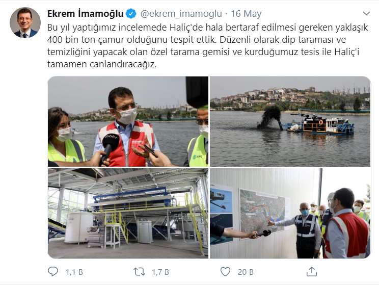 İstanbul Büyükşehir Belediye Başkanı Ekrem İmamoğlu, dün yaptığı Twitter paylaşımında Haliç'in dibinde hala 400 bin ton çamur olduğunu tespit ettiklerini ve temizliğe başlayacaklarını duyurdu. İmamoğlu, "Bu yıl yaptığımız incelemede Haliç'de hala bertaraf edilmesi gereken yaklaşık 400 bin ton çamur olduğunu tespit ettik. Düzenli olarak dip taraması ve temizliğini yapacak olan özel tarama gemisi ve kurduğumuz tesis ile Haliç'i tamamen canlandıracağız." ifadelerini kullandı.
