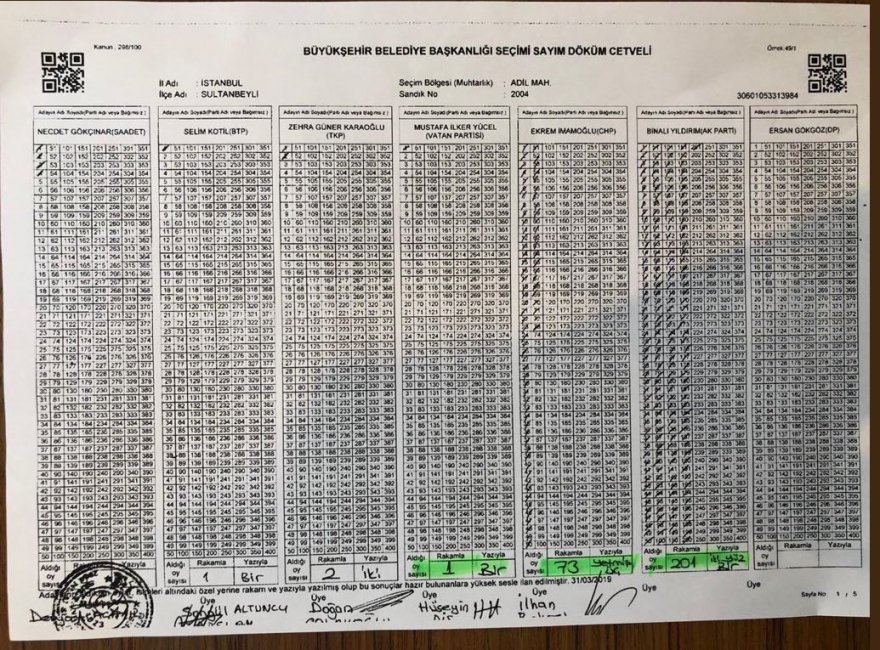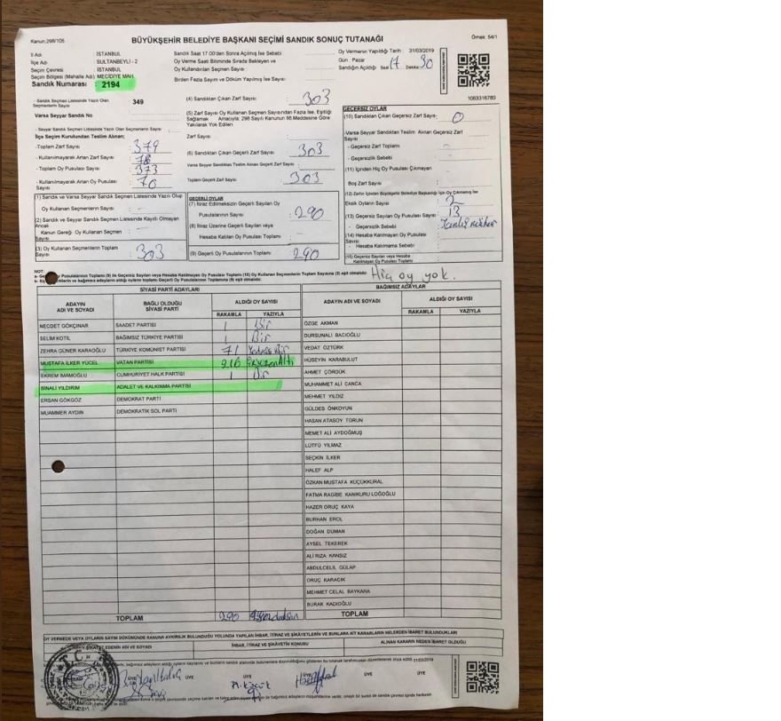 Yine Sultanbeyli'de 2194 nolu sandıkta da Binali Yıldırım hiç oy almamış gözüküyor...