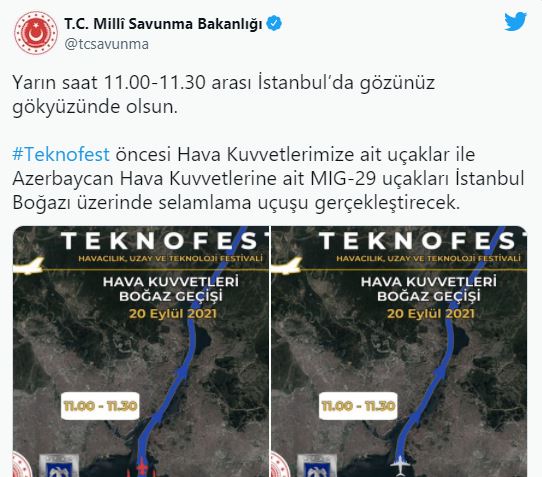 "Yarın saat 11.00-11.30 arası İstanbul’da gözünüz gökyüzünde olsun. Teknofest öncesi Hava Kuvvetlerimize ait uçaklar ile Azerbaycan Hava Kuvvetlerine ait MIG-29 uçakları İstanbul Boğazı üzerinde selamlama uçuşu gerçekleştirecek."