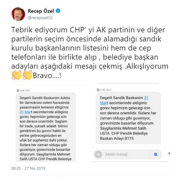 AK Parti'nin resmi başvurusu üzerine kabul edilmeyerek sandık kurulu başkan ve üyelerinin isim ve telefon listesi hiçbir partiyle paylaşılmazken CHP'lilerin elinde olması kafalarda soru işareti bıraktı. Üstelik bir de CHP'li Belediye Başkan adayının sandık kurulu başkanına mesaj atması bu şüpheyi artırıyor.