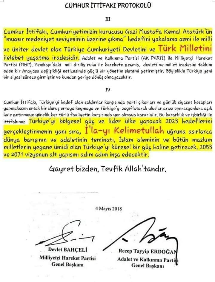 Protokolde 'Cumhur İttifakı, Cumhuriyetimizin kurucusu Gazi Mustafa Kemal Atatürk’ün “muasır medeniyet seviyesinin üzerine çıkma” hedefini yakalama azmi ile milli ve üniter devlet olan Türkiye Cumhuriyeti Devletini ve Türk Milletini ilelebet yaşatma iradesidir.' denilirken Türkiye’yi küresel bir güç haline getirecek, 2053 ve 2071 vizyonun alt yapısının da inşa edilmek istendiği ortaya çıktı.