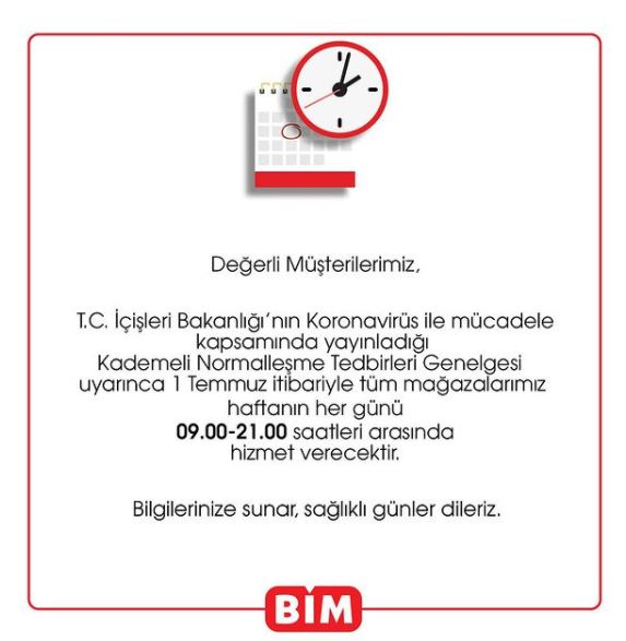 BİM ve A101 sosyal medya hesaplarından yeni çalışma saatlerini duyurdu. Diğer zincir marketler ise henüz bir açıklama yapmadı.