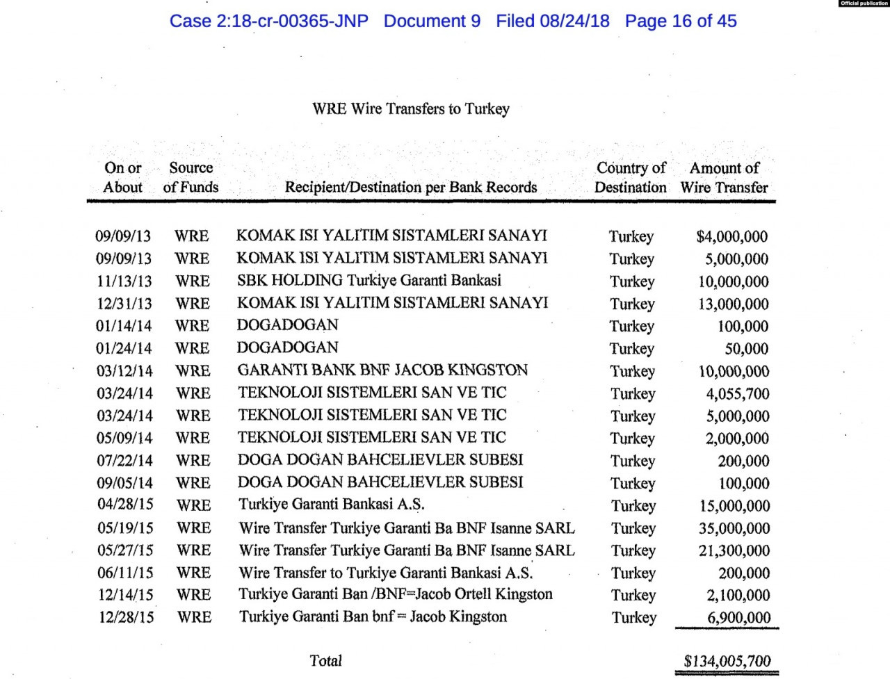 -11 Ağustos 2016 tarihinde SBK Holdings USA Inc. tarafından transfer edilen 15 milyon dolar