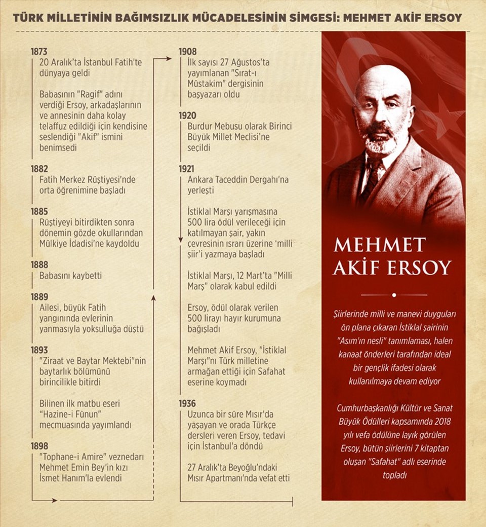Mehmet Akif Ersoy'un İstiklal Marşı, 17 Şubat günü Sırat-ı Müstakim ve Hakimiyet-i Milliye'de yayımlandı. Hamdullah Suphi Bey tarafından Meclis'te okunup ayakta dinlenen İstiklal Marşı, 12 Mart 1921'de "Milli Marş" olarak kabul edildi. Ersoy, ödül olarak verilen 500 lirayı hayır kurumuna bağışladı.