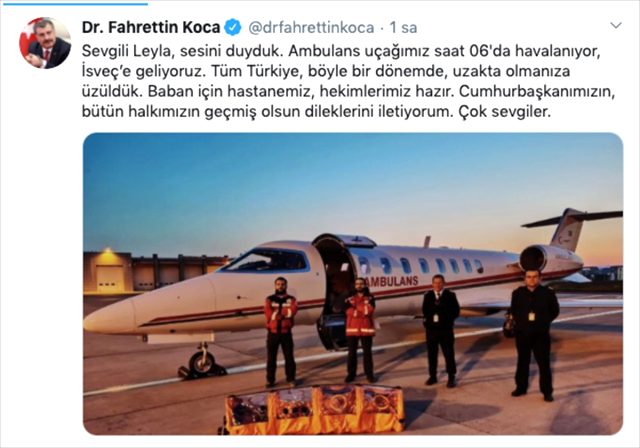 "Sevgili Leyla, sesini duyduk. Ambulans uçağımız saat 06.00'da havalanıyor, İsveç'e geliyoruz. Tüm Türkiye, böyle bir dönemde, uzakta olmanıza üzüldük. Baban için hastanemiz, hekimlerimiz hazır. Cumhurbaşkanımızın, bütün halkımızın geçmiş olsun dileklerini iletiyorum. Çok sevgiler."