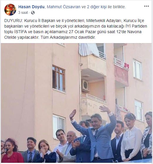 Doydu çağrısında 'Kurucu İl Başkan ve il yöneticileri, Milletvekili Adayları, Kurucu İlçe başkanları ve yöneticileri ve birçok yol arkadaşımızın da katılacağı İYİ Partiden toplu İstifa ve basın açıklamamız 27 Ocak Pazar günü saat 12'de Navona Otelde yapılacaktır.' dedi.