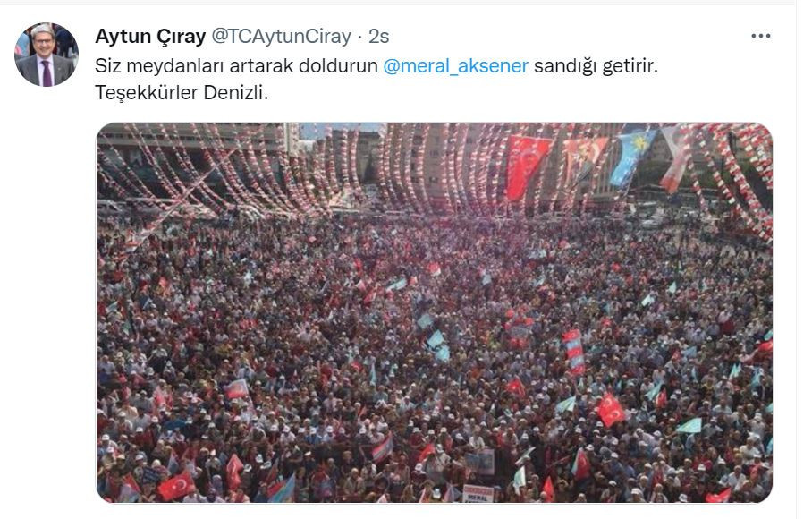 İYİ Parti İzmir Milletvekili ve Genel Başkan Danışmanı sıfatları taşıyan Aytun Çıray, Akşener'in dün Denizli'de gerçekleştirdiği mitingle ilgili paylaşım yaparken 2018 Haziran'ında Kocaeli'de yapılan mitingte çekilmiş bir fotoğraf paylaştı ve "Siz meydanları artarak doldurun, Meral Akşener sandığı getirir. Teşekkürler Denizli." ifadelerini kullandı.