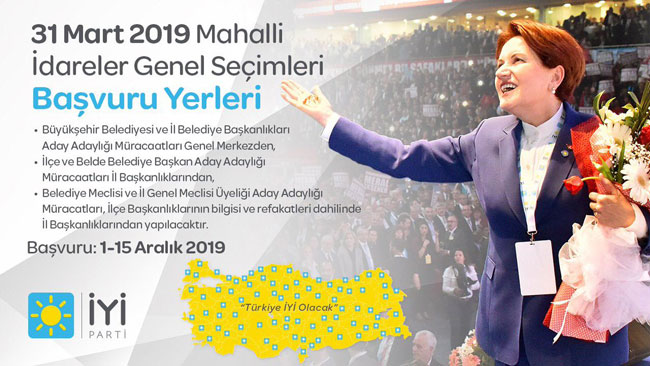 İlk yerel seçim sınavını 31 Mart 2019’da verecek olan Meral Akşener’in Genel Başkanı olduğu İYİ Partide aday adaylığı başvurularının bugün itibariyle resmen başladı. Parti Genel Merkezi’nden yapılan duyuruda başvuru sürecinin 15 Aralık’ta sona ereceği kaydedildi.