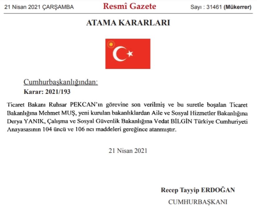 Ticaret Bakanlığı'na dezenfektan satmakla gündeme gelen Ticaret Bakanı Ruhsar Pekcan'ın görevine son verildi. Yerine AKP Grup Başkanvekili Mehmet Muş atandı.